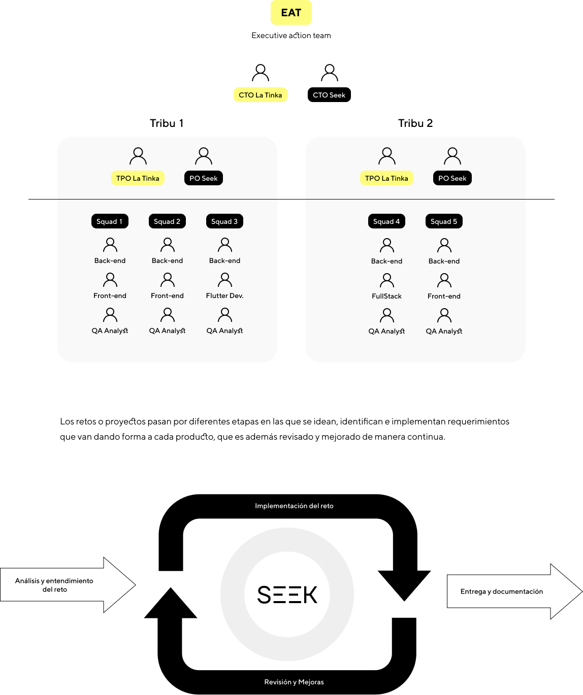 Actualmente, actuamos como partners estratégicos de desarrollo tecnológico, teniendo 5 squads dedicados a tiempo completo, totalmente entrelazados cultural y operativamente con el equipo de La Tinka, enfocados en construir plataformas digitales que resuelvan retos concretos del negocio.